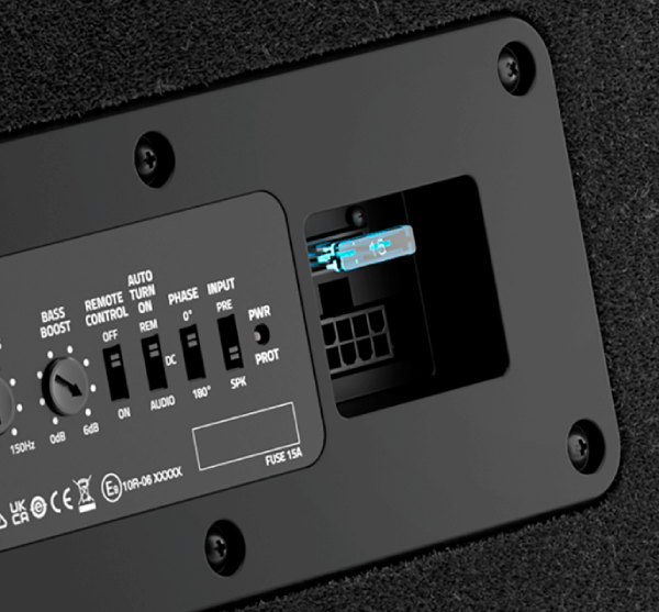 The 440 W Class-D amplifier provides an unmatched performance/size ratio, drawing less current from the vehicle’s electrical system. He-Li technology (high efficiency/low impedance) is optimized for the 0.4 Ω load of the DBA 201 subwoofer driver, and the sealed enclosure.