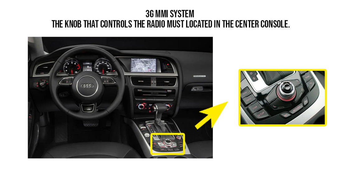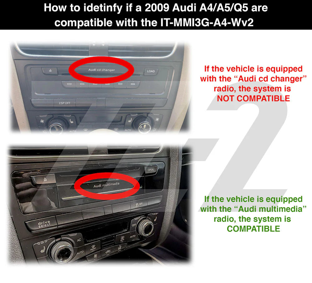 *Note: 2009 A4/A5/Q5 must be equipped with the "Audi multimedia" radio in order to be compatible with the our IT-MMI3G-A4 kit. Vehicles equipped with the "Audi cd changer" radio are NOT compatible. Check pictures to qualify the vehicle before placing the order.